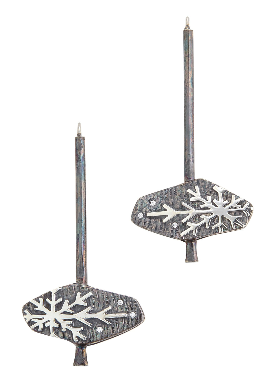 Snowflake Oxidized Sterling Silver Tree Bark Texture Drop Earrings With High Polish Off Center Sterling Silver Snowflake and Three 1mm Cubic Zirconias in Each Earring